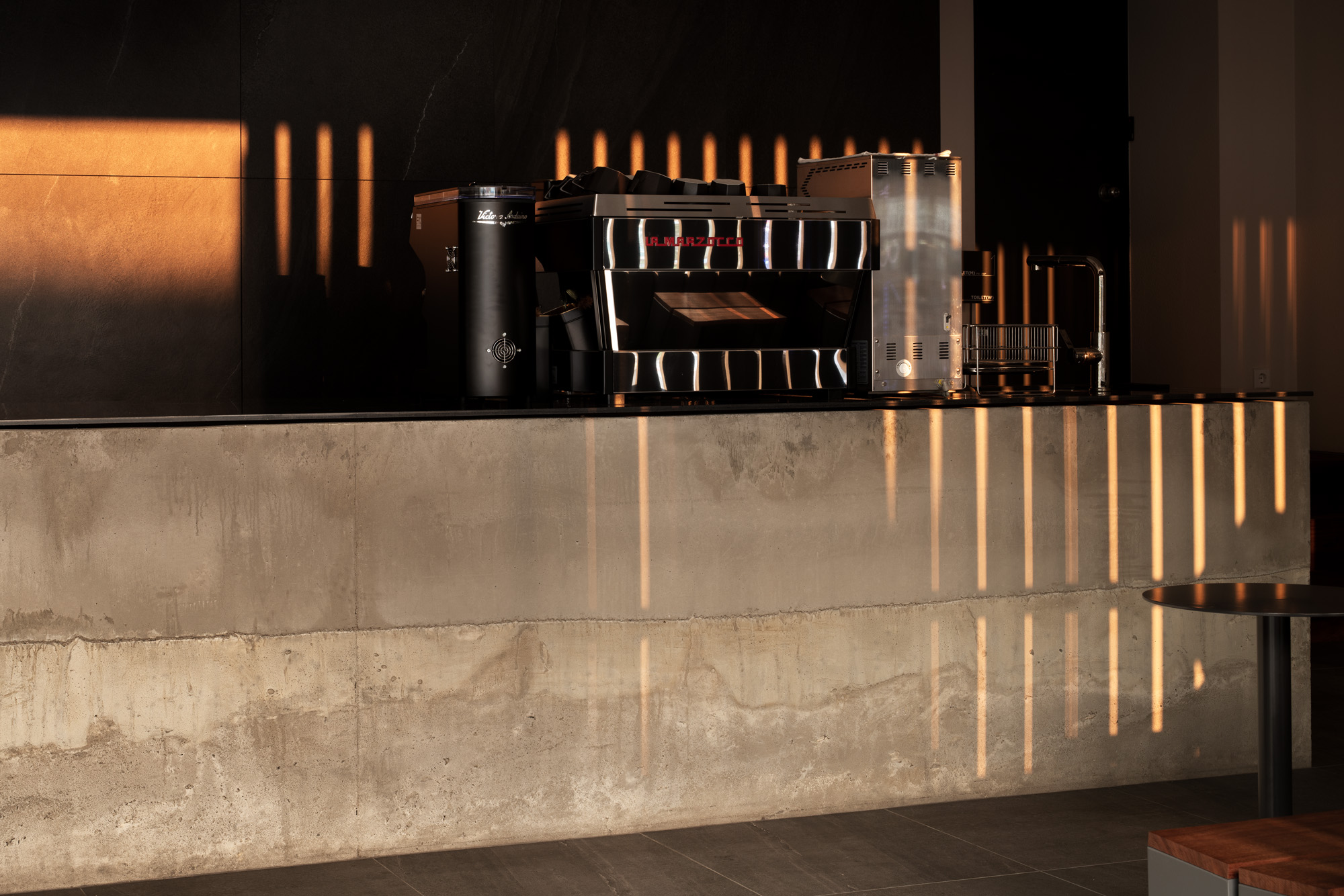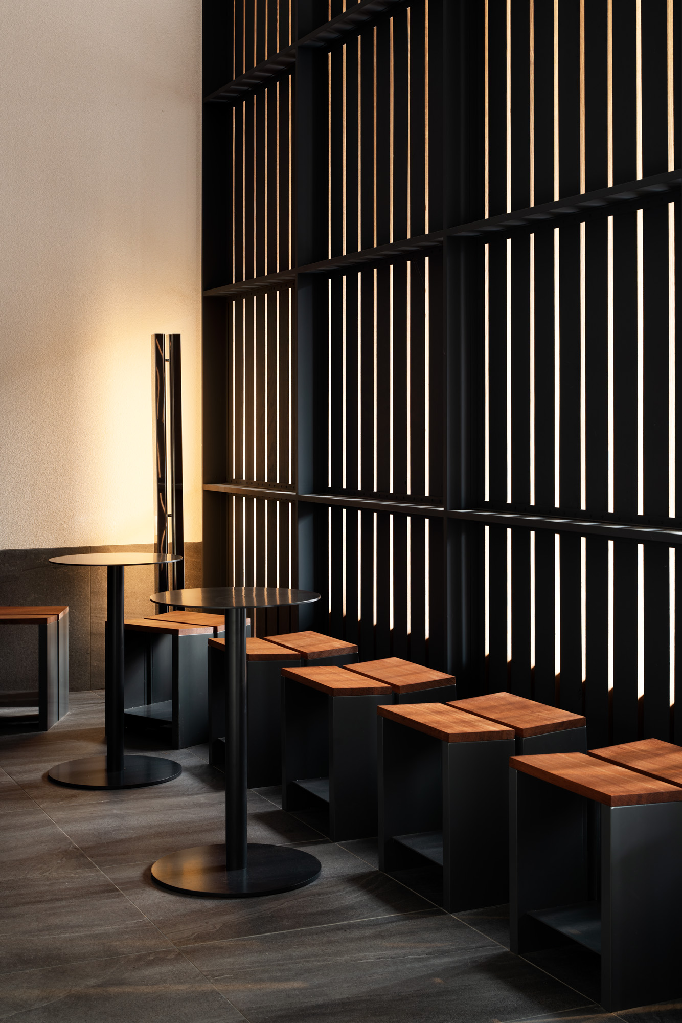 이월 로스터스 실내에 높게 세운 벽은 새로운 ‘경계’를 공간적으로 표현한 것으로, 건물 외부와 내부를 나누는 외벽의 경계를 내부로 들여와 새로운 파사드를 구성하고자 했다. 벽을 기준으로 안쪽과 바깥쪽은 조도와 프로그램 구성을 달리 하여 이용하는 이들로 하여금 또 다른 공감각적 경계를 느끼도록 의도했다.