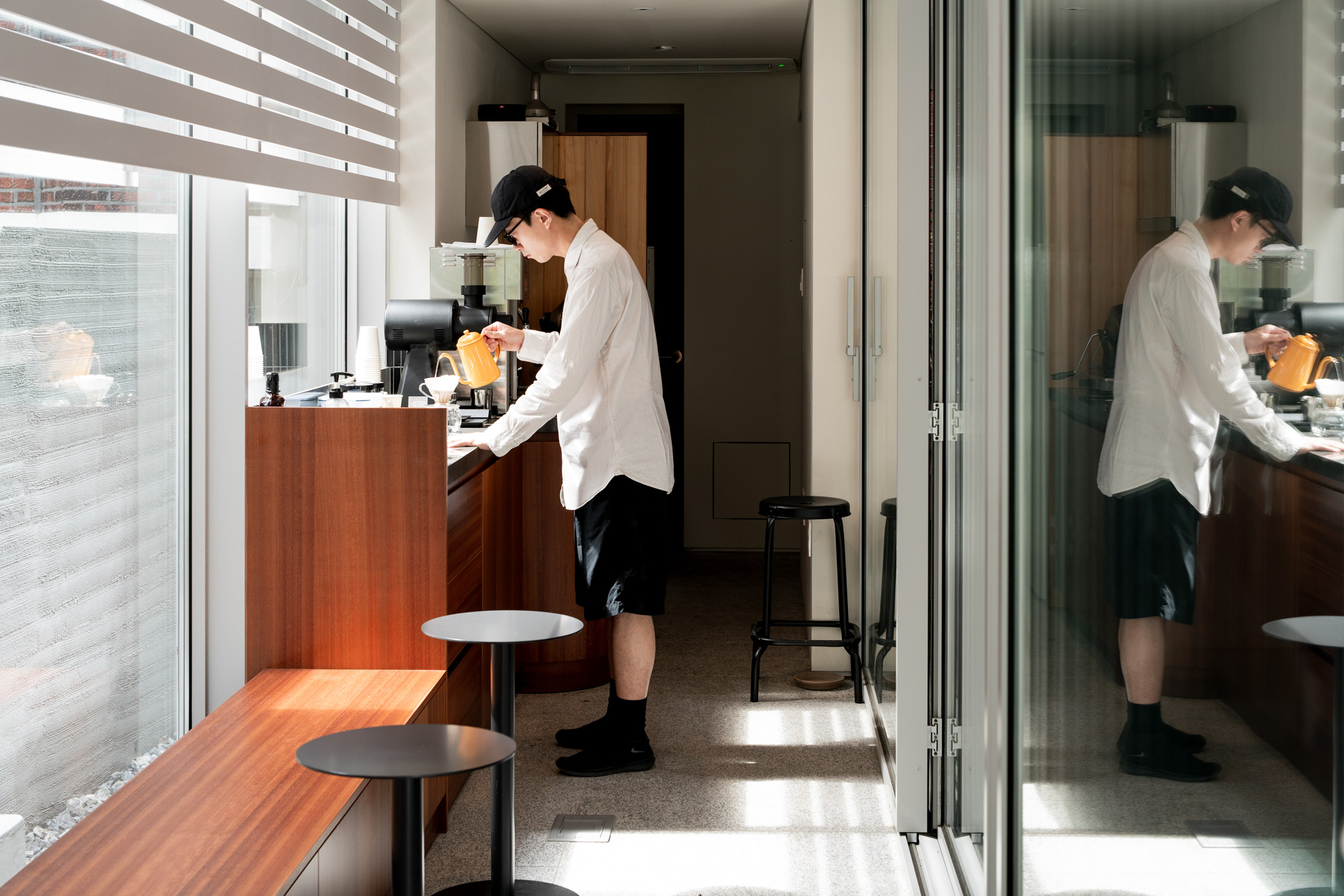 바리스타의 작업은 가장 안쪽 공간에서부터 로스팅, 그라인딩, 핸드드립 순서로 진행되며 완성된 커피 한 잔은 자연스럽게 손님의 테이블로 전달됩니다.